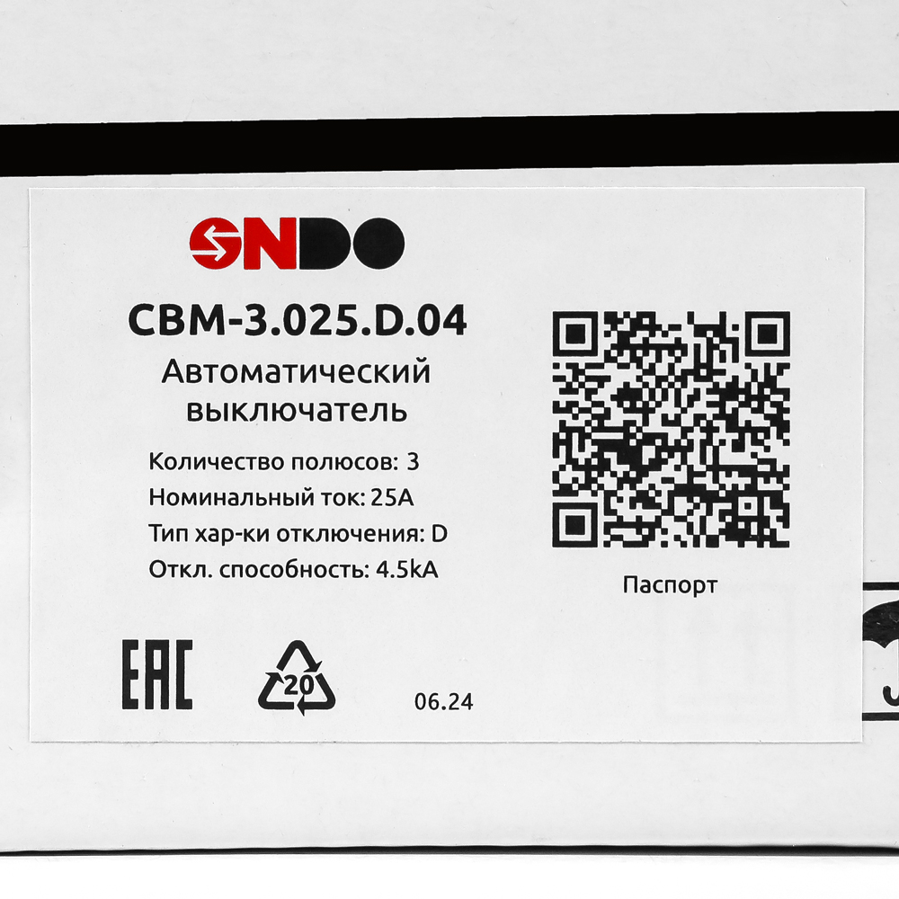 Авт. выключатель модульный, 3-полюсный, 25А, хар. D, 4,5кА, ~230/400В, монтаж на DIN-рейку