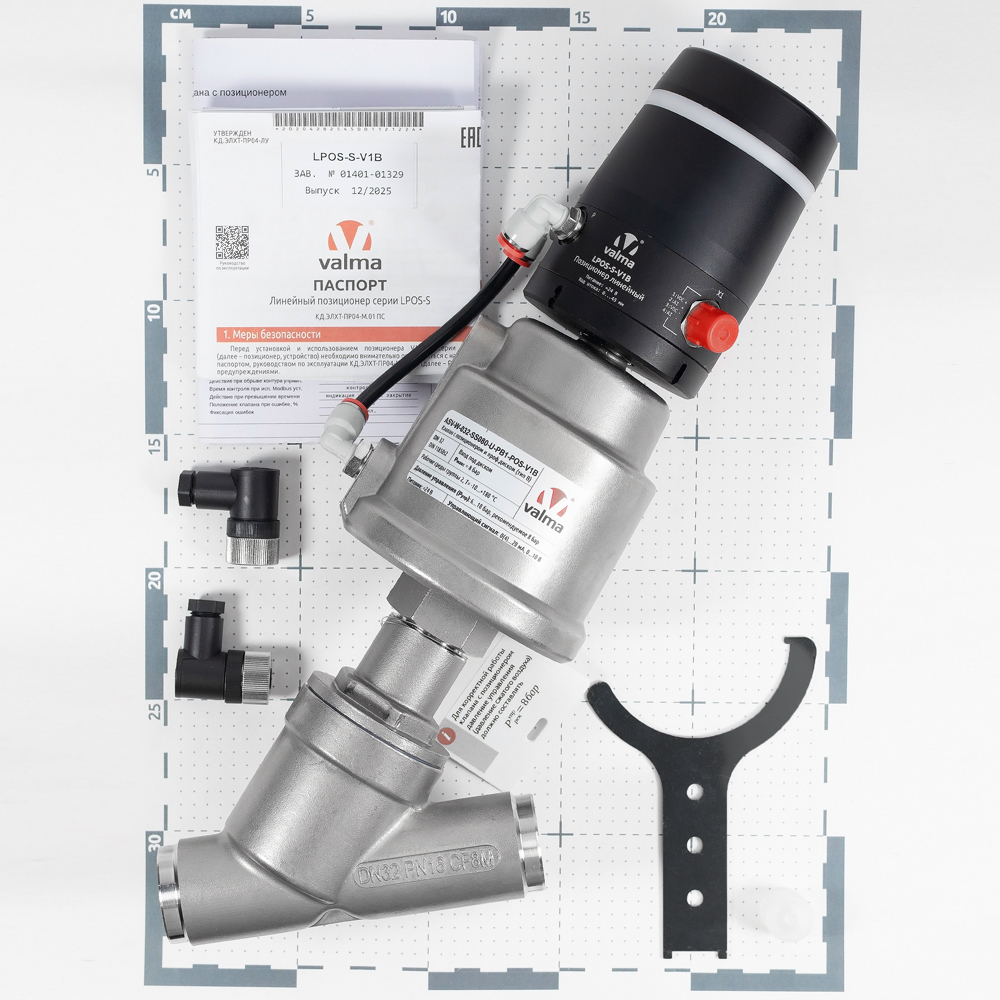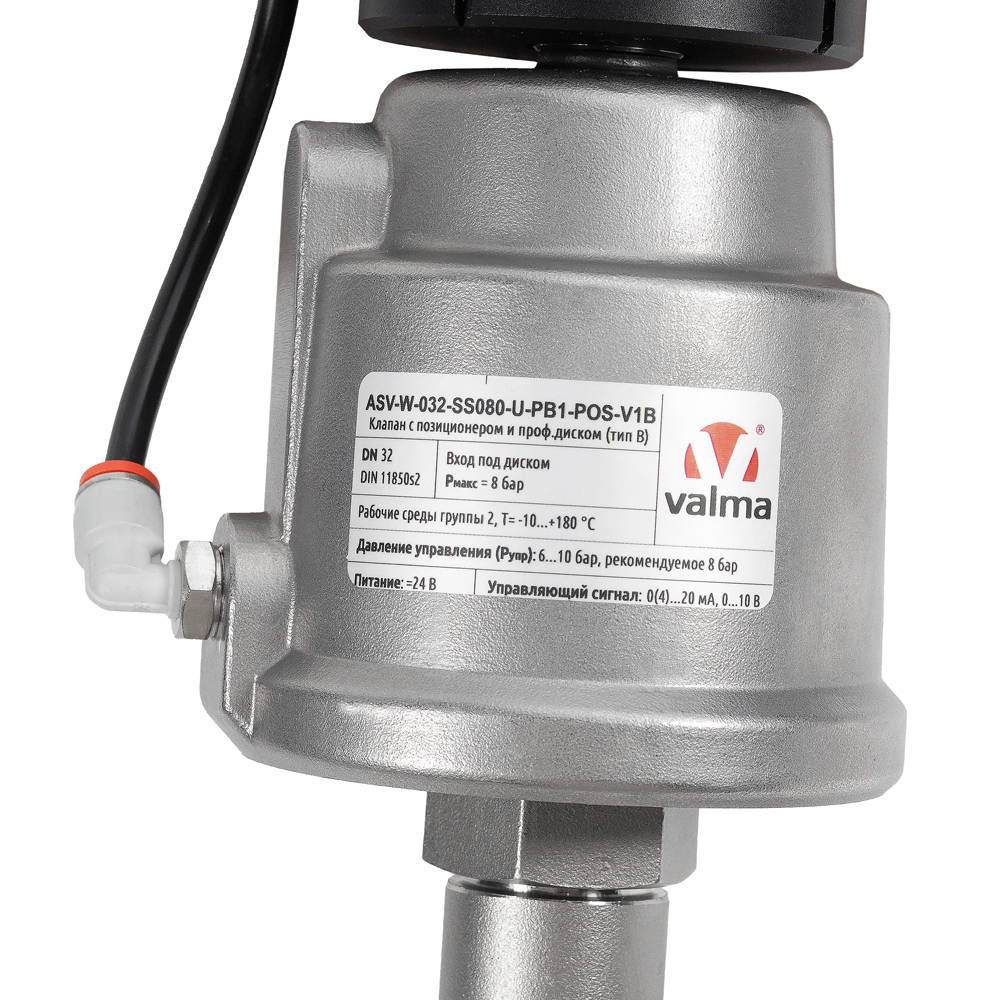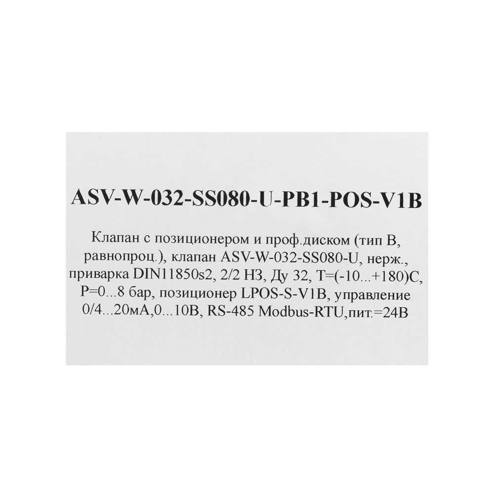 Клапан с позиционером и проф.диском (тип B, равнопроц.), клапан ASV-W-032-SS080-U, нерж., приварка DIN11850s2, 2/2 НЗ, Ду 32, T=(-10...+180)C, P=0...8 бар, позиционер LPOS-S-V1B, управление 0/4...20мА,0...10В, RS-485 Modbus-RTU,пит.=24В